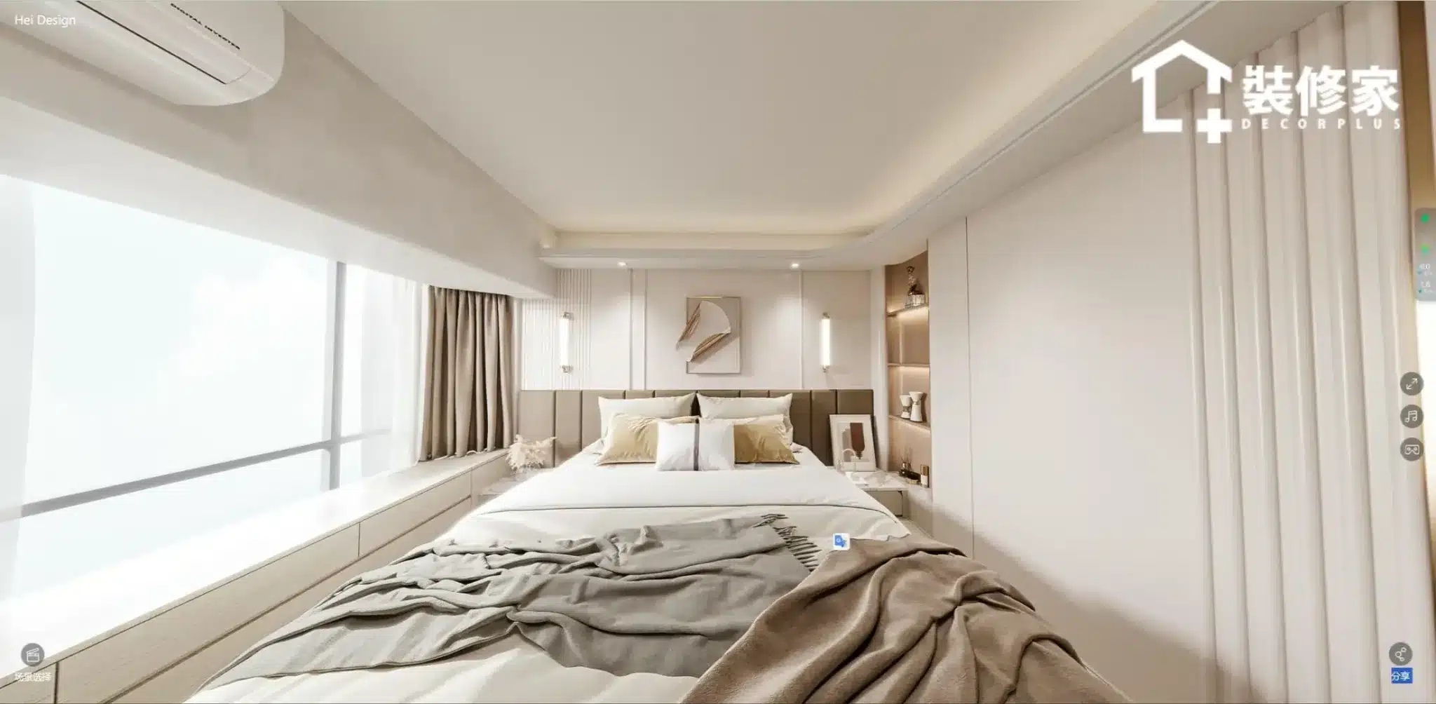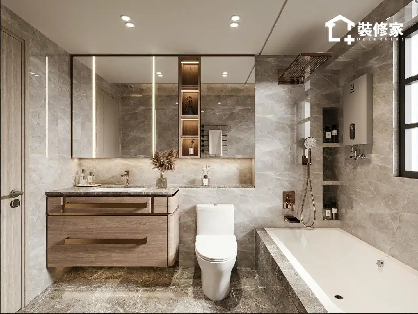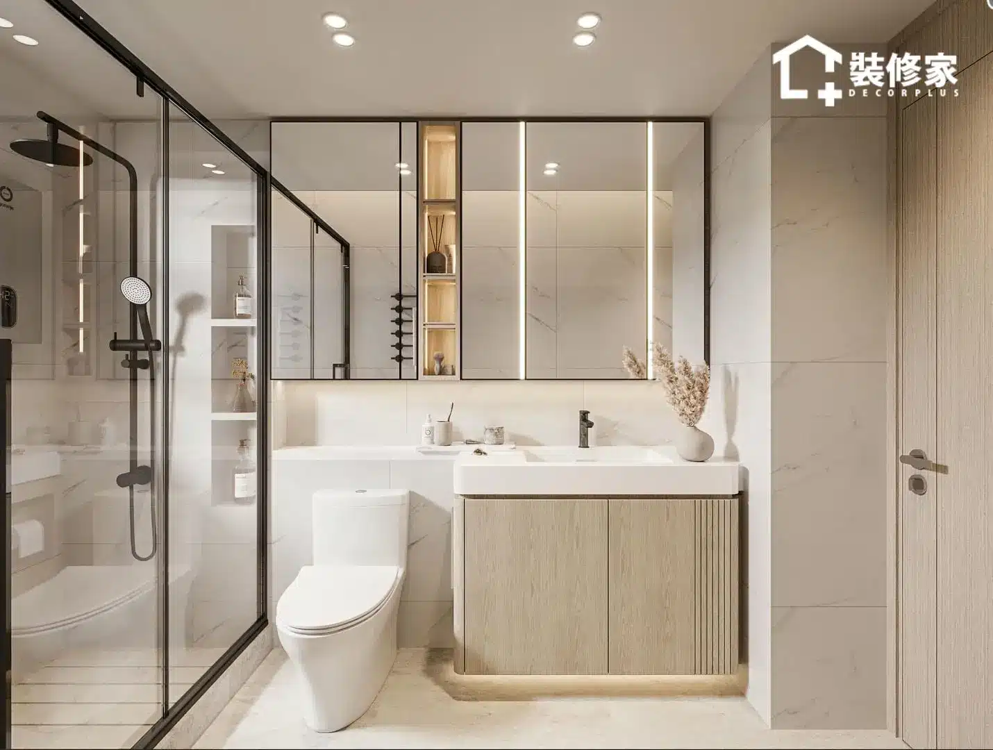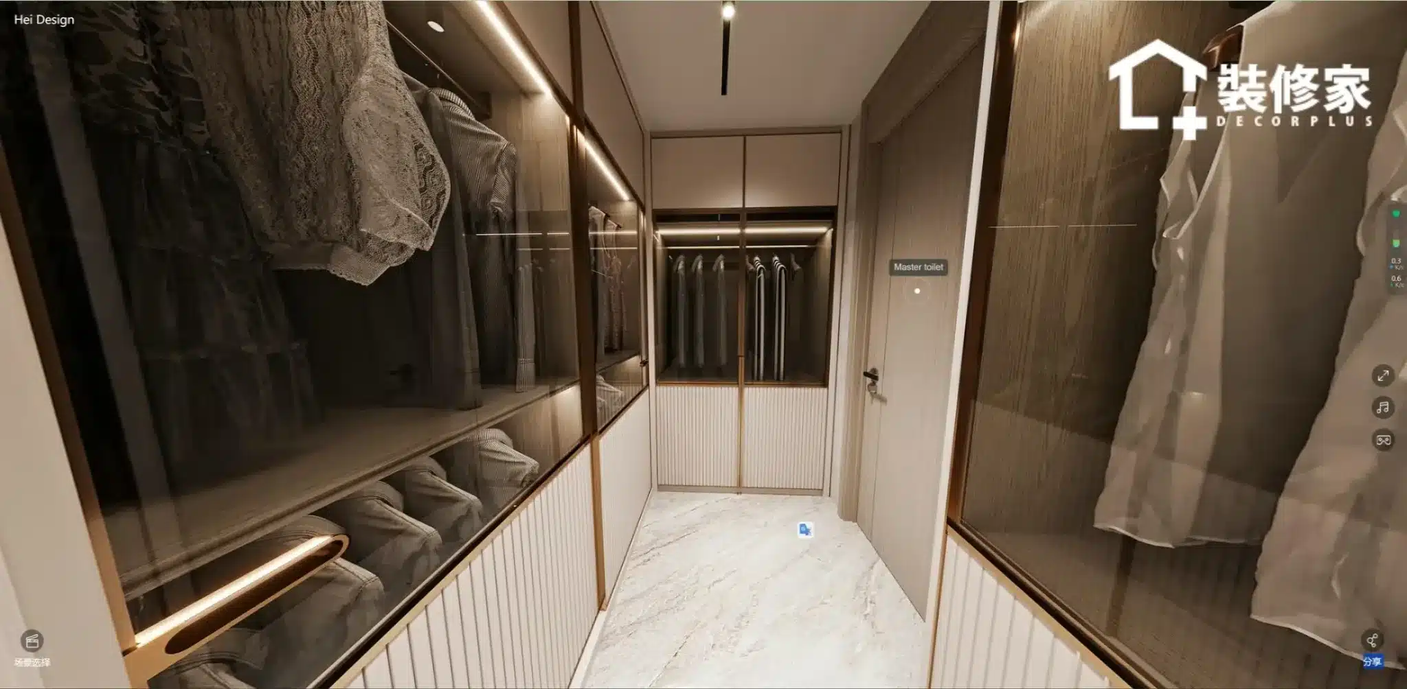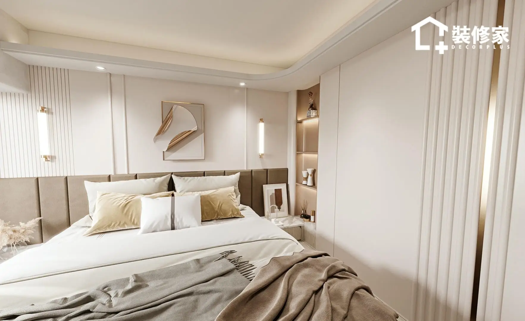 主人房設計強調實用與品味兼備,背景牆配以直紋與金屬飾條點綴,營造酒店式質感。衣帽間更運用玻璃櫃門與內藏燈帶,展現收藏品味。浴室以淺灰與米白色雲石鋪陳,配合懸浮櫃體與燈光層架,散發低調而典雅的輕奢格調,整體設計簡潔利落,精緻感十足