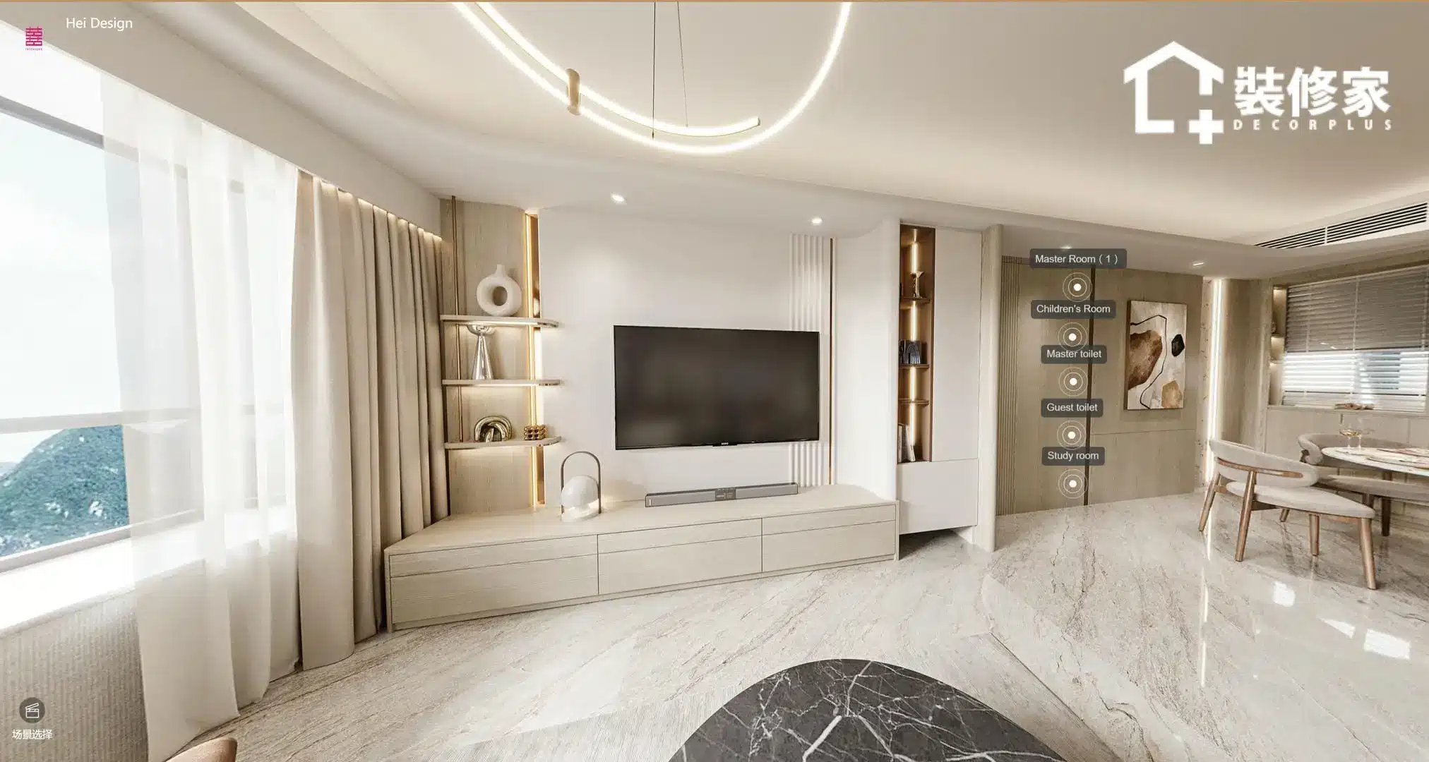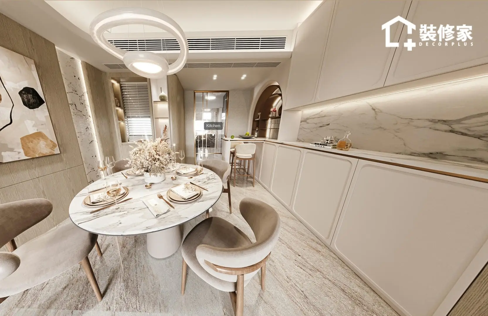 嘉麗苑A座的室內設計以輕奢風與現代風為主調,透過米白、淺啡、香檳金等柔和色彩,構建出一個高雅而寧靜的居家氛圍。客飯廳採用大面積大理石飾面牆,配合弧形天花與特色燈飾,突顯空間的層次與設計感。餐桌及吊燈選用圓潤造型,加強整體的溫潤氛圍,線條流暢不失氣派。