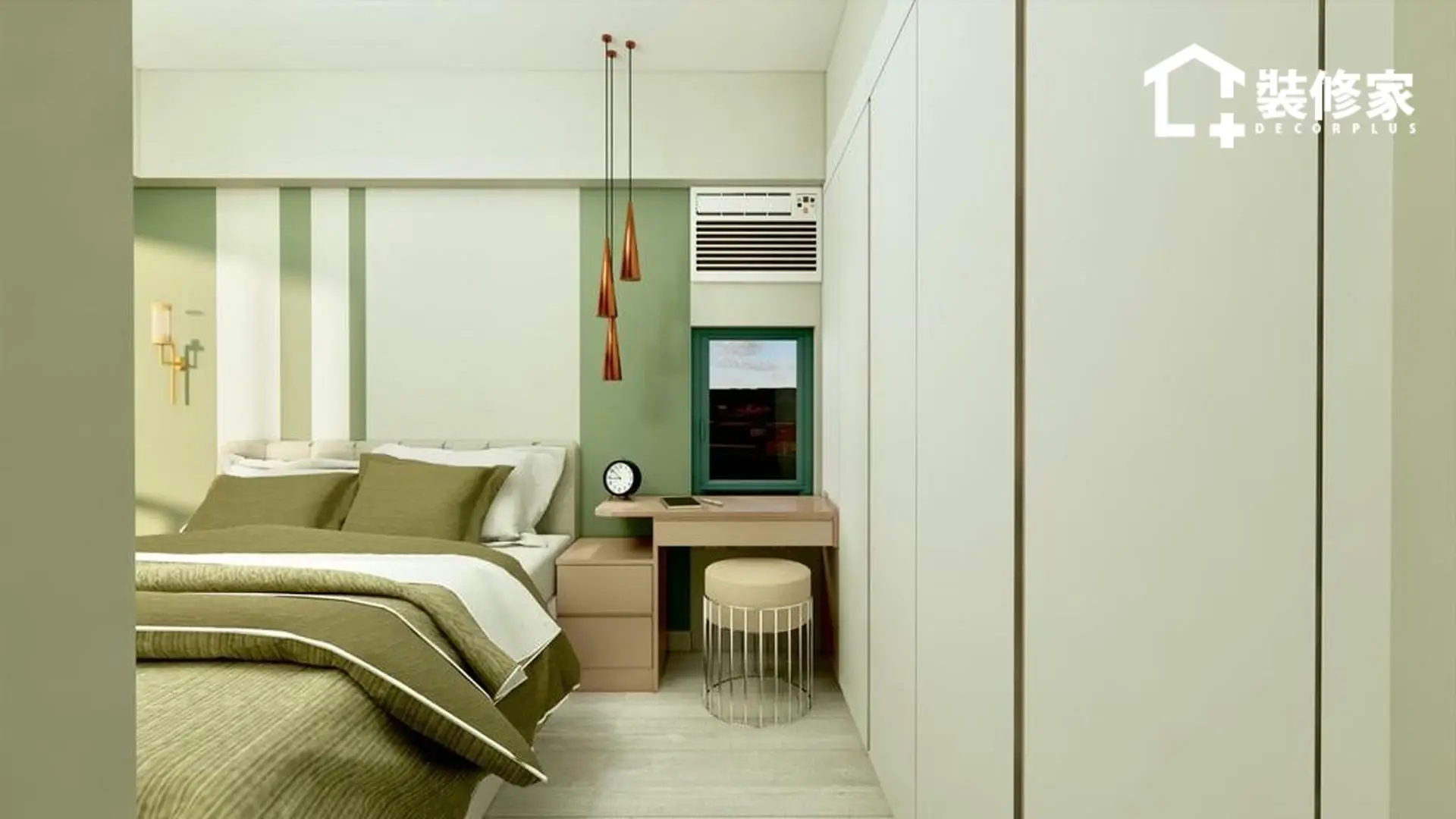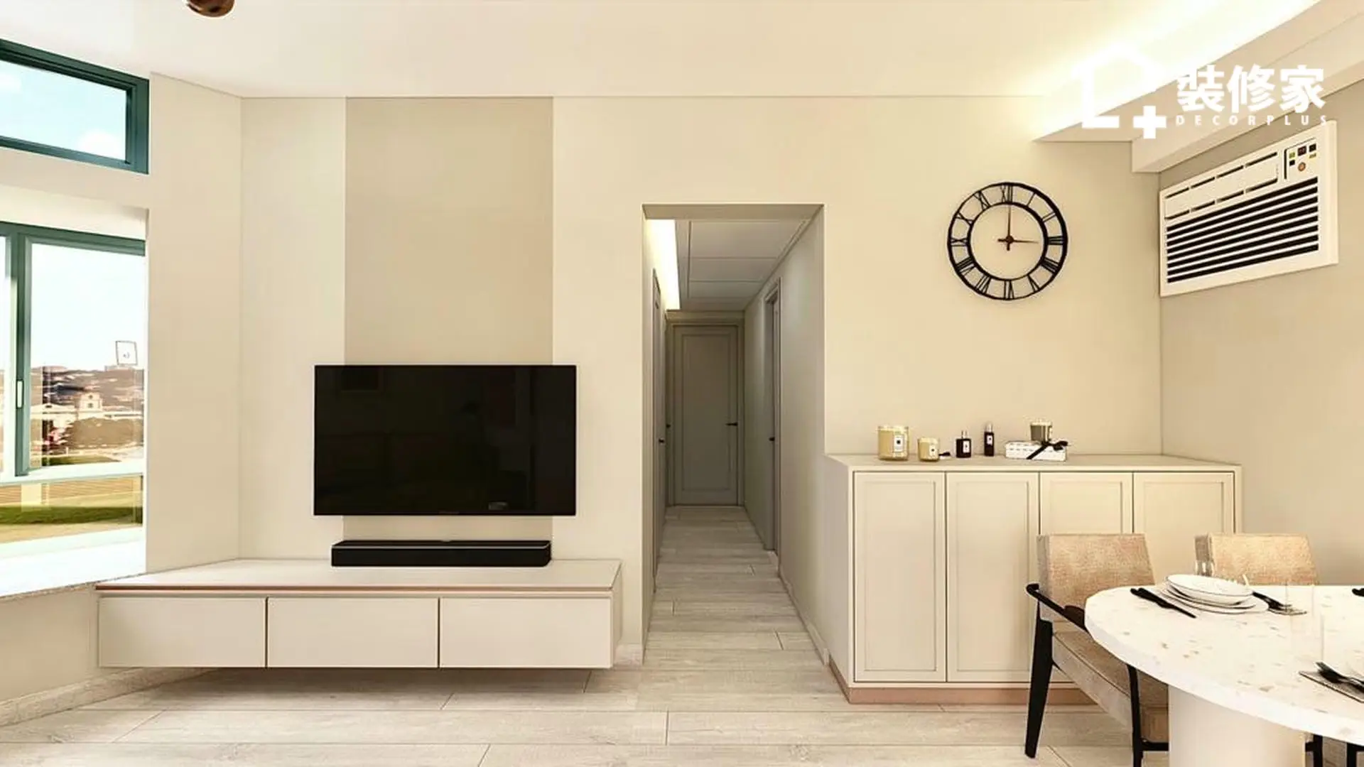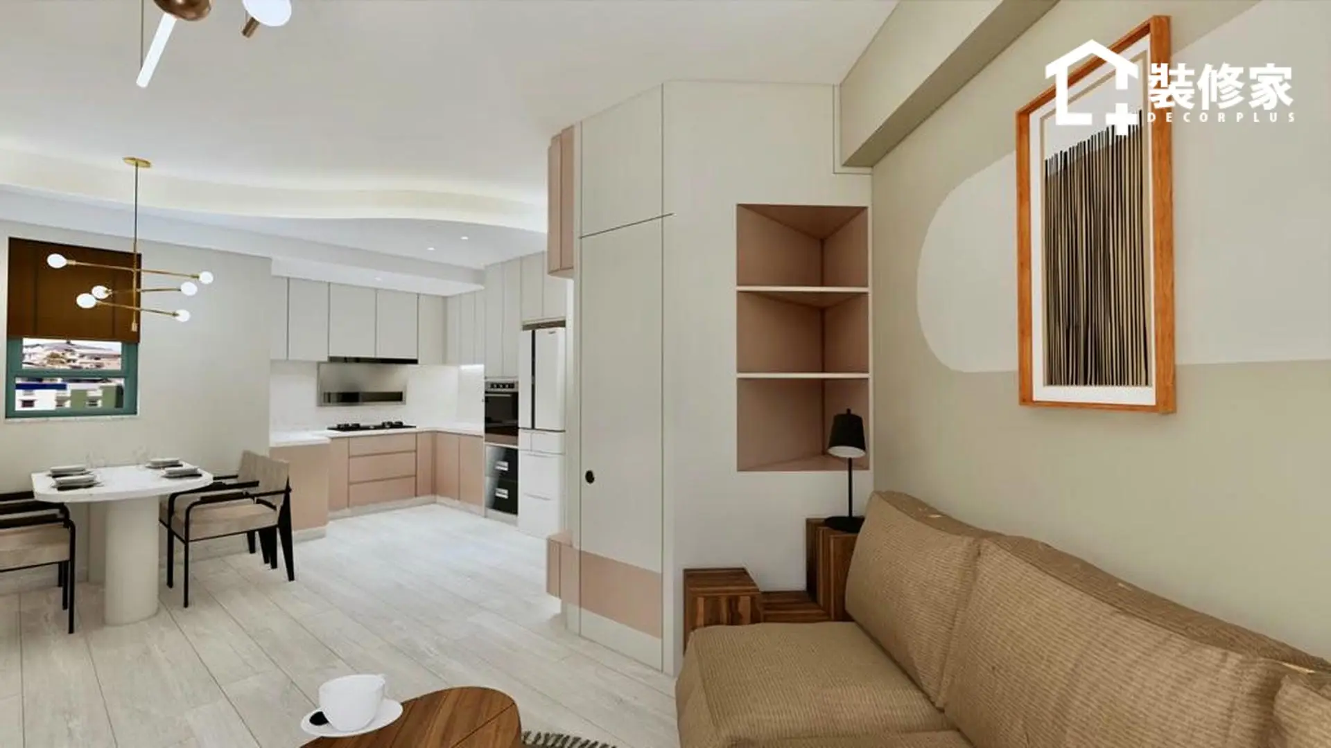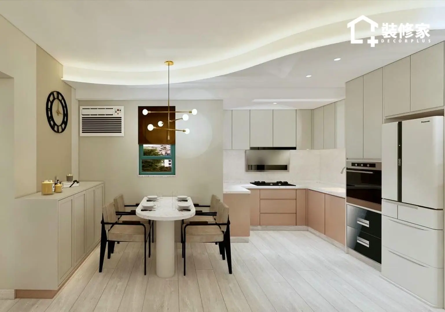 空間的佈局經過精心規劃,兼顧收納與美學。客廳與飯廳採開放式設計,增強空間感並提升採光效果。客廳選用懸浮式電視櫃與簡約掛鐘作為點綴,展現北歐風格的純粹與輕盈。廚房則以白色與裸粉色相間的櫥櫃搭配,提升空間的層次感,使視覺更顯柔和。臥室則運用不同層次的綠色牆面裝飾,並搭配暖色系燈光,增添溫暖的休憩氛圍。