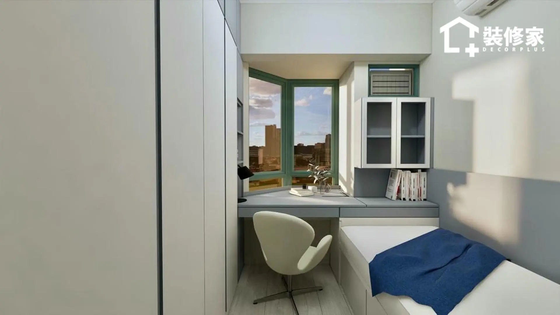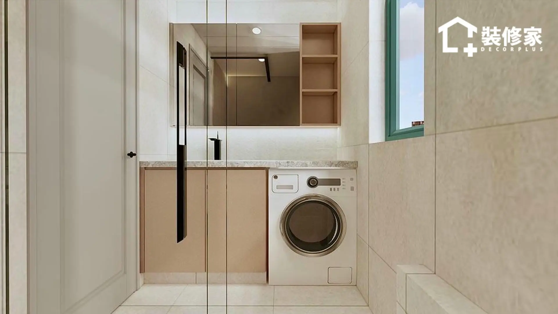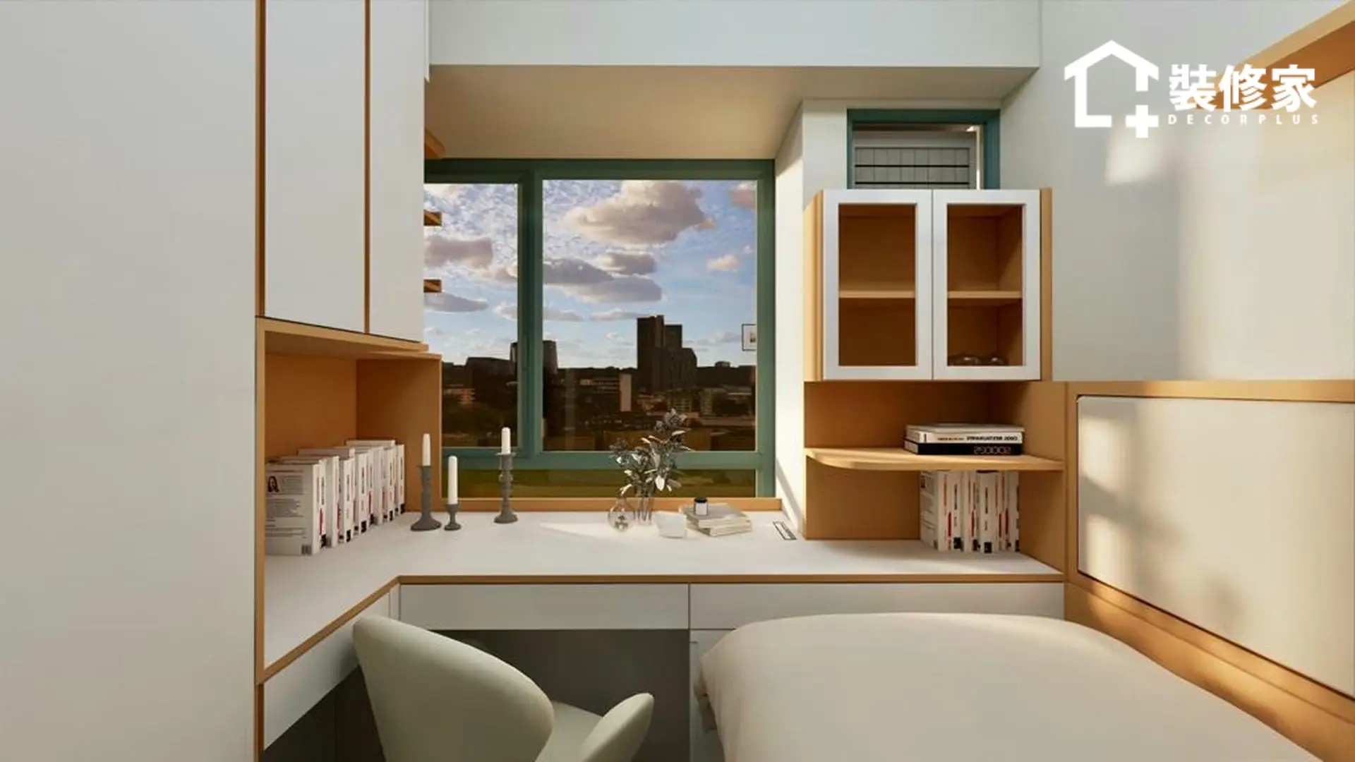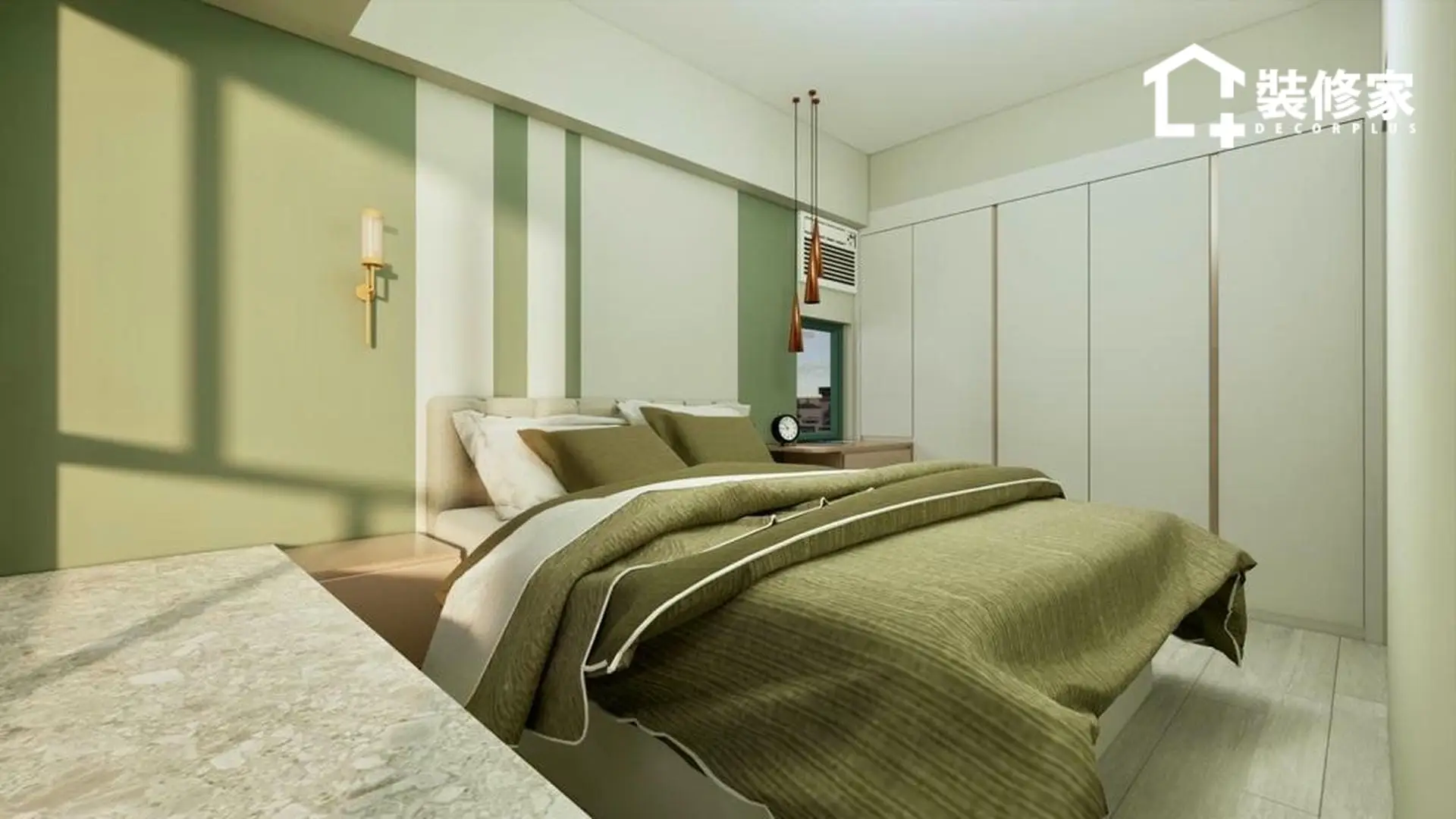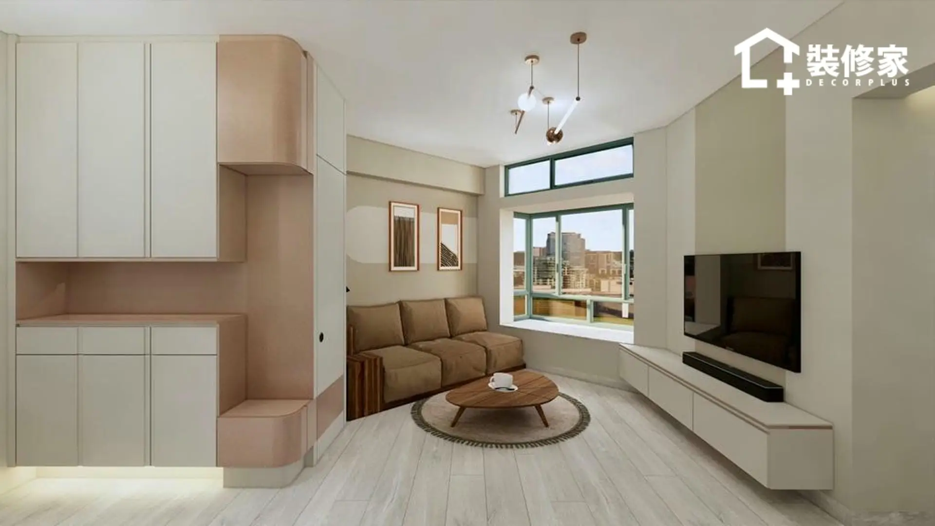 空間的佈局經過精心規劃,兼顧收納與美學。客廳與飯廳採開放式設計,增強空間感並提升採光效果。客廳選用懸浮式電視櫃與簡約掛鐘作為點綴,展現北歐風格的純粹與輕盈。廚房則以白色與裸粉色相間的櫥櫃搭配,提升空間的層次感,使視覺更顯柔和。臥室則運用不同層次的綠色牆面裝飾,並搭配暖色系燈光,增添溫暖的休憩氛圍。