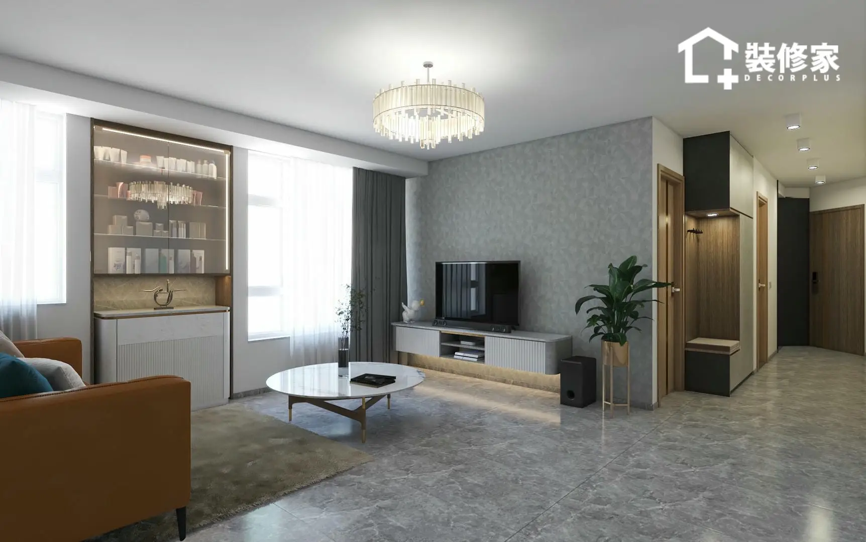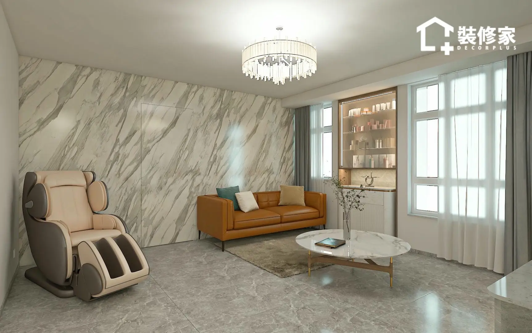 客廳空間透過大面積的天然石材牆面與優雅的金屬線條,塑造出沉穩而富層次的視覺效果。水晶吊燈與隱藏燈帶的應用,使整體照明更具層次感,營造溫暖的氛圍。開放式櫃體搭配玻璃與金屬框架,讓收納與展示功能兼備,既提升空間利用率,也突顯時尚品味。